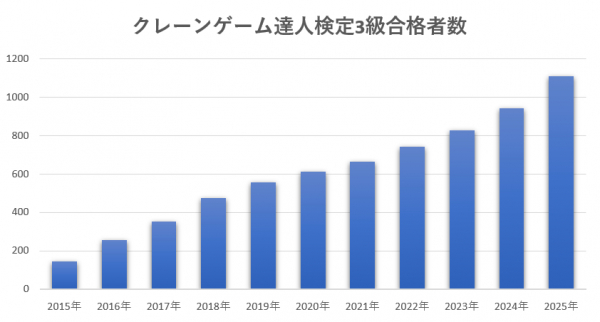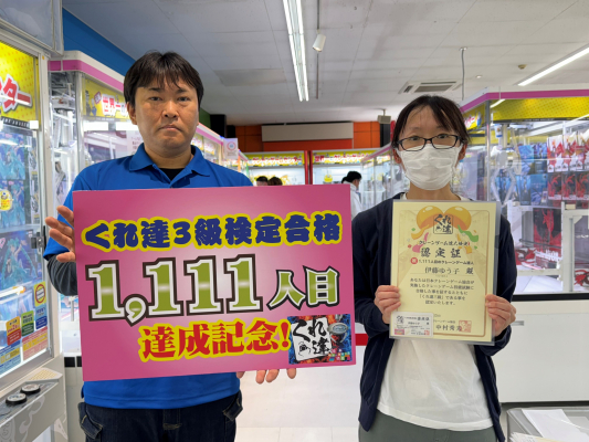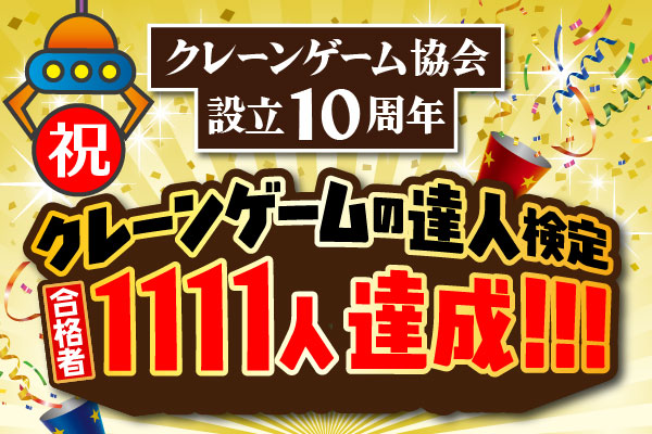 クレーンゲームに関する資格『クレーンゲームの達人検定(以下、くれ達検定)』を唯一認定・発行する一般社団法人日本クレーンゲーム協会(代表理事:中村秀夫/所在地:埼玉県行田市)は、2015年の設立し12月25日に11周年を迎える当協会の認定資格「クレーンゲーム達人検定3級」が11月15日に累計合格者が1111人を突破しました。今後もクレーンゲームの健全な発展と技術の普及を目的に活動してまいります。