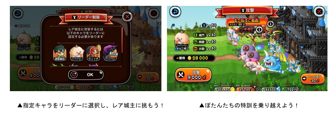 「バトル」から「ひとりで」または「みんなで」を選び、「攻撃」を選択すると、ランダムでレア城主が出現するレア城主イベントを開催いたします。