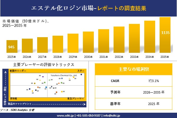 SDKI Analytics(本社:東京都渋谷区)は、このたび、2025年11月12に「エステル化ロジン市場調査レポート:2026―2035年の市場規模、シェア、傾向の予測」を発表しました。エステル化ロジンに関する市場調査レポートには、統計的及び分析的アプローチを使用した予測評価が含まれています。この調査レポートでは、一次及び二次調査方法を使用して分析された主要な業界洞察を通じて将来の傾向を理解できるようにすることで、主要な市場動向を読者に説明しています。