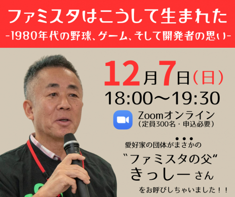 2026年12月10日にファミスタが発売されて40周年を迎えます。39年間ファミスタを遊び続けている愛好家団体によるプレ40周年イベントとして、2025年12月7日(日)にオンラインで、ファミスタの開発者であるきっしー(岸本好弘)さんの講演と初代ファミスタ東西対抗戦を開催いたします。