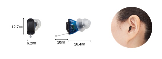耳あなにスッポリ収まり、装用すると黒いフェイスプレートはほとんど見えません。本体は約0.8gと1円玉より軽く、長時間着けていても疲れにくくなっています。