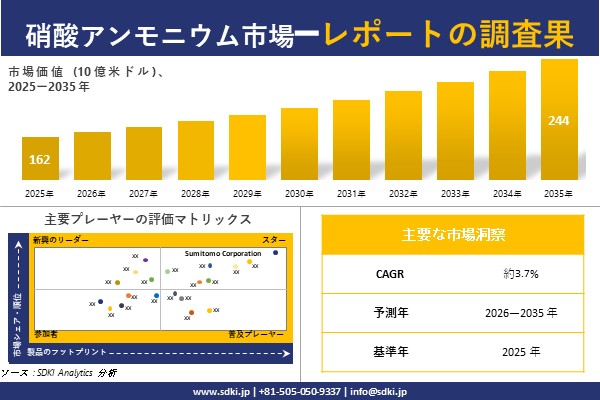 SDKI Analytics(本社:東京都渋谷区)は、このたび、2025年11月14に「硝酸アンモニウム市場調査レポート:2026-2035年の市場規模、シェア、傾向の予測」を発表しました。硝酸アンモニウムに関する市場調査レポートには、統計的及び分析的アプローチを使用した予測評価が含まれています。この調査レポートでは、一次及び二次調査方法を使用して分析された主要な業界洞察を通じて将来の傾向を理解できるようにすることで、主要な市場動向を読者に説明しています。