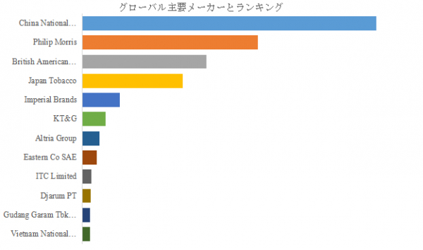 LP Informationのトップ企業研究センターによると、タバコの世界的な主要製造業者には、China National Tobacco Corporation、Philip Morris、British American Tobacco、Japan Tobacco、Imperial Brands、KT&G、Altria Group、Eastern Co SAE、ITC Limited、Djarum PTなどが含まれている。2024年、世界のトップ5企業は売上の観点から約77.0%の市場シェアを持っていた。