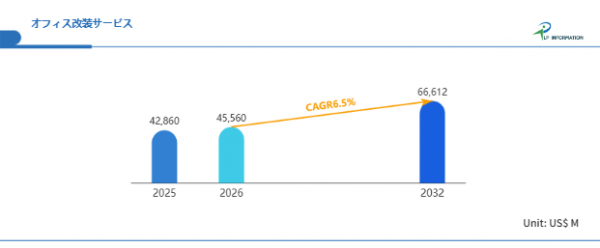 LP Information調査チームの最新レポートである「世界オフィス改装サービス市場の成長予測2026~2032」(https://www.lpinformation.jp/reports/592265/office-refurbishment-service)によると、2026年から2032年の予測期間中のCAGRが6.5%で、2032年までにグローバルオフィス改装サービス市場規模は666億米ドルに達すると予測されている。