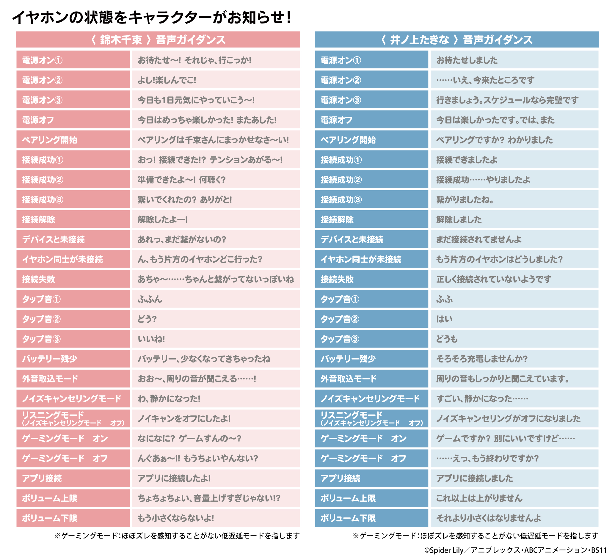 本コラボレーションモデルは「錦木千束」「井ノ上たきな」の2モデル。作品タイトルを充電ケースに、作品モチーフを左右ハウジングプレートに配置。音声ガイダンスは「錦木千束」「井ノ上たきな」の新規録り下ろしボイスを搭載。電源オンやオフ、ペアリング時やタップ音、ノイズキャンセリングモード時等、それぞれ計24ワードのボイスを楽しめます。パッケージは描き下ろしイラストデザインとなっております。