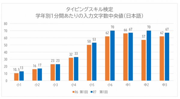 令和7年度 第1回の検定では、1分間あたりの入力文字数(中央値)は令和6年度 第1回タイピングスキル検定と比較するとほぼ全学年で増加しました。(※小学3年生のみ同じ)
