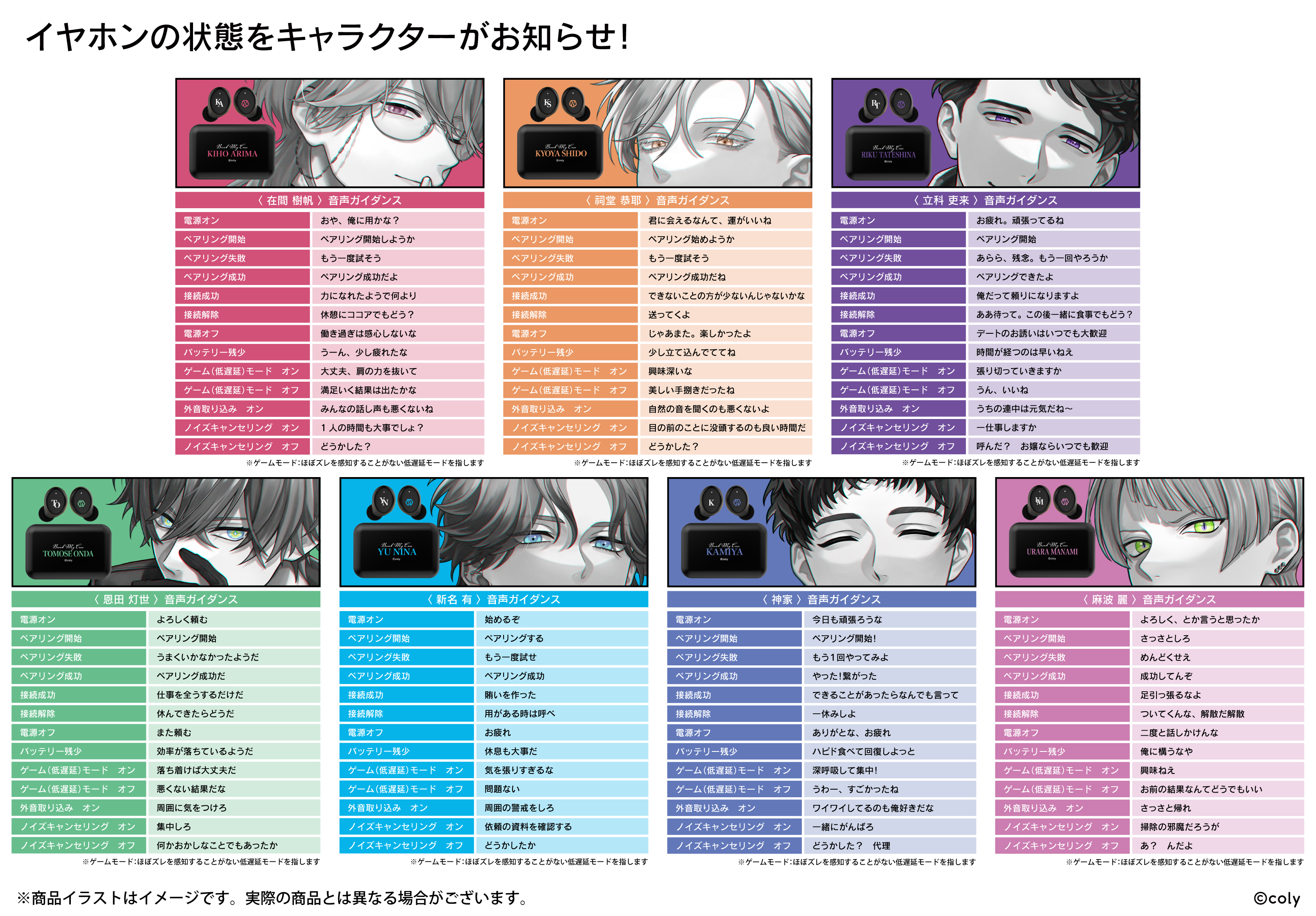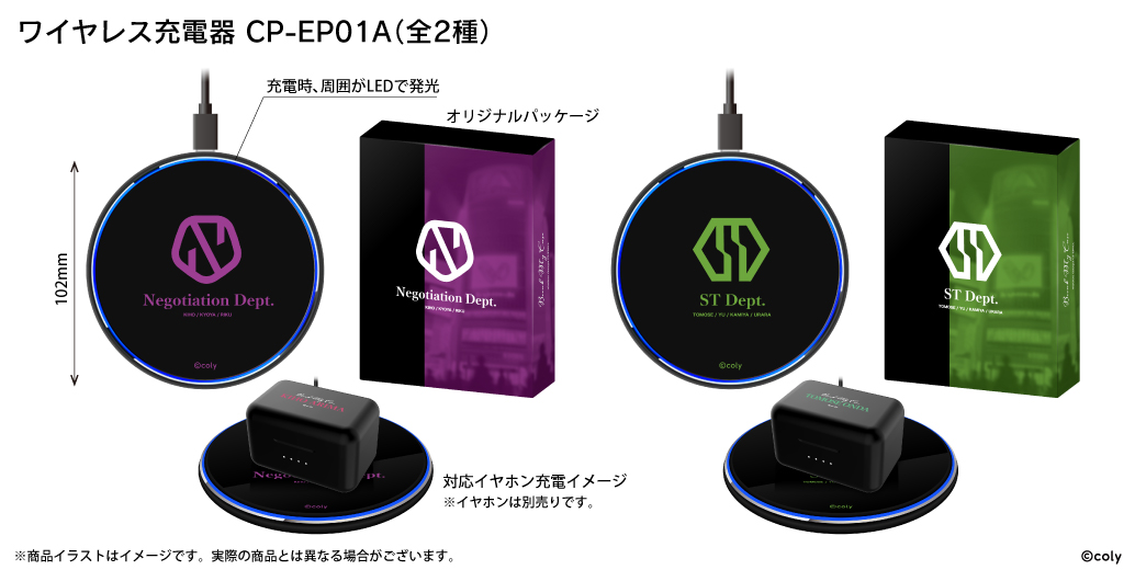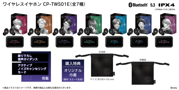 本モデルは、第3弾として「交渉部」より在間樹帆(CV:佐藤拓也)、祠堂恭耶(CV:福山潤)、立科吏来(CV:小西克幸)、「特務部」より恩田灯世(CV:小林裕介)、新名有(CV:坂田将吾)、神家(CV:仲村宗悟)、麻波麗(CV:吉野裕行)の録り下ろし音声ガイダンス(各モデル全13ワード)を搭載。また、充電ケースには作品タイトルとキャラクター名を、イヤホン本体にはキャラクター名の頭文字と所属マークをあしらい、日常使いしやすいおしゃれで洗練されたデザインに仕上げました。また、特典で各所属部のオリジナル巾着が付きます。