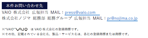 VAIO株式会社(本社:長野県安曇野市 代表取締役社長:山野 正樹 以下VAIO)と株式会社ノジマ(神奈川県横浜市 代表執行役社長 野島廣司 以下ノジマ)は対象機種購入から3年以内にバッテリーの満充電容量が80%以下になった場合、バッテリーを無償で交換する『VAIOバッテリー保証サービス』の提供をノジマ店舗にて、12月1日(月)より開始いたします。