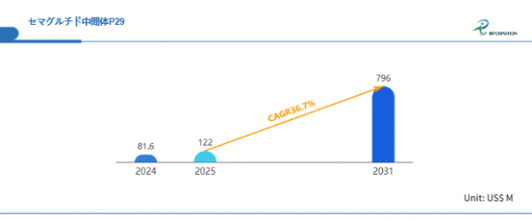 LP Information調査チームの最新レポートである「世界セマグルチド中間体P29市場の成長予測2025~2031」(https://www.lpinformation.jp/reports/564672/semaglutide-intermediate-p29)によると、2025年から2031年の予測期間中のCAGRが36.7%で、2031年までにグローバルセマグルチド中間体P29市場規模は7.96億米ドルに達すると予測されている。