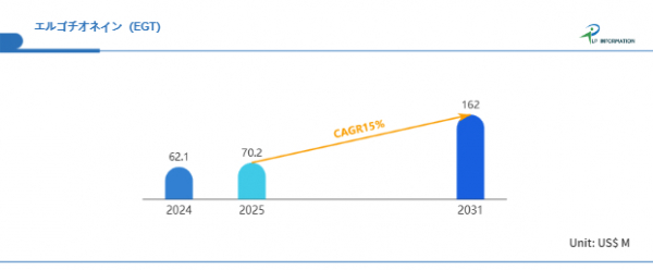 LP Informationの「世界エルゴチオネイン(EGT)市場の成長予測2025~2031」(https://www.lpinformation.jp/reports/50533/l-ergothioneine--egt)によれば、エルゴチオネイン(EGT)市場は、2025年から2031年の予測期間において年平均成長率15%と非常に高い伸びを示すとされ、2031年には世界市場規模が1.6億米ドルに達すると見込まれている。背景には、老化抑制・認知症予防・皮膚保護といった高付加価値テーマに対する消費者関心の高まりがある。特に、高齢化が進行する先進国市場では、EGTを活用した機能性食品やサプリメントの需要が増加傾向にあり、「自然由来の安心成分」として差別化のキーとなっている。また、化粧品領域においては、紫外線による皮膚ダメージ軽減や色素沈着抑制といったEGTの効果が期待され、高価格帯ブランドを中心に採用が広がっている。健康意識の高まりとエビデンスに基づく製品設計の潮流が重なり、EGT市場は今後も持続的な需要を獲得する見通しである。