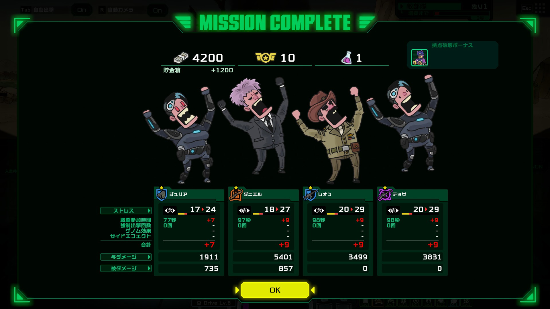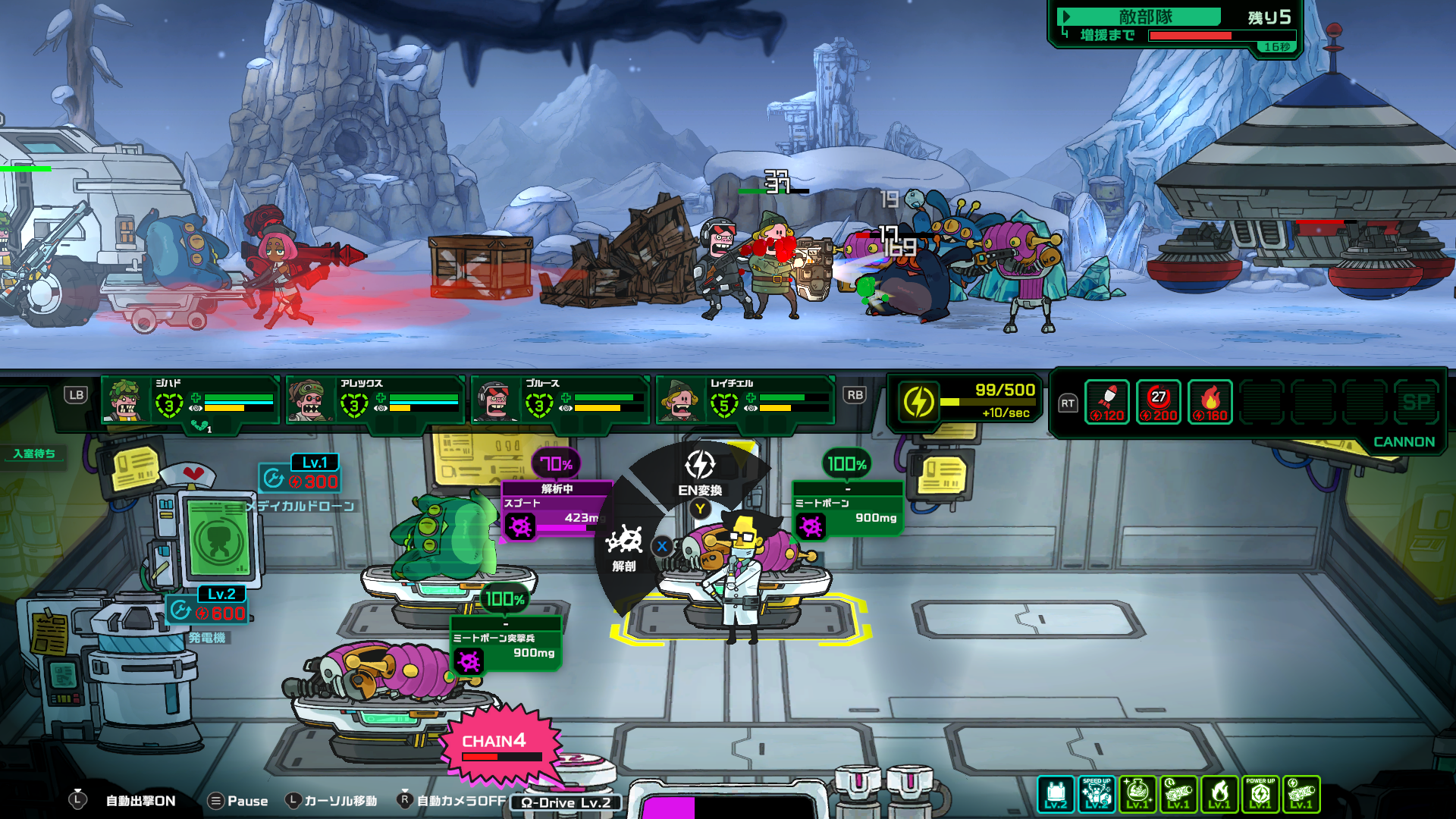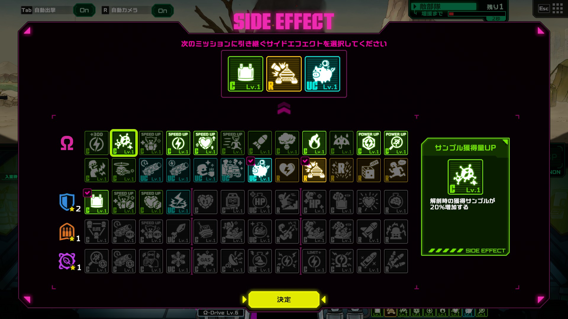 戦闘で撃破したエイリアンを回収・解剖することで“サンプル”を獲得できます。一定量のサンプルが集まれば「Ωドライブ」がレベルアップし、部隊を強化する“サイドエフェクト”を入手できます。また、エイリアンを解剖せずにEN(エネルギー)へ変換することも可能で、どちらを優先するかは状況に応じた選択が必要です。部隊の治療とエイリアンの解剖、その判断が作戦の明暗を分けます。
