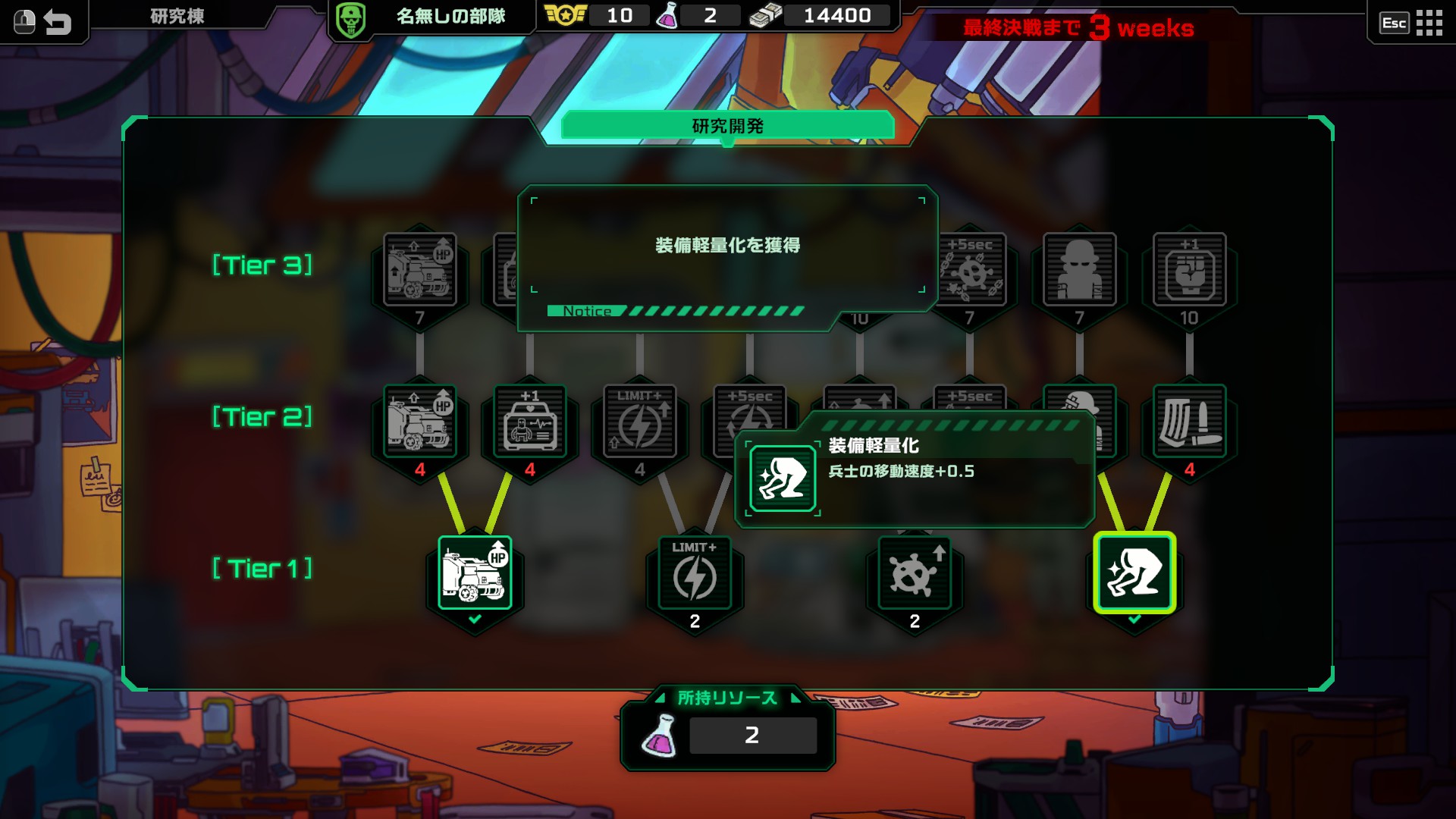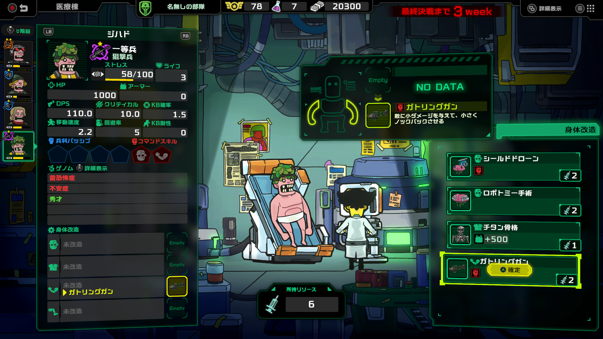 兵士に身体改造を施すことでステータスを強化したり、新たなコマンドスキルを習得させることができます。さらに「ゲノム編集」で遺伝的特性を付与し、能力値を大幅に底上げすることも可能です。基地内の「研究棟」では、さまざまな研究を進めることで部隊全体に永続効果を付与できます。