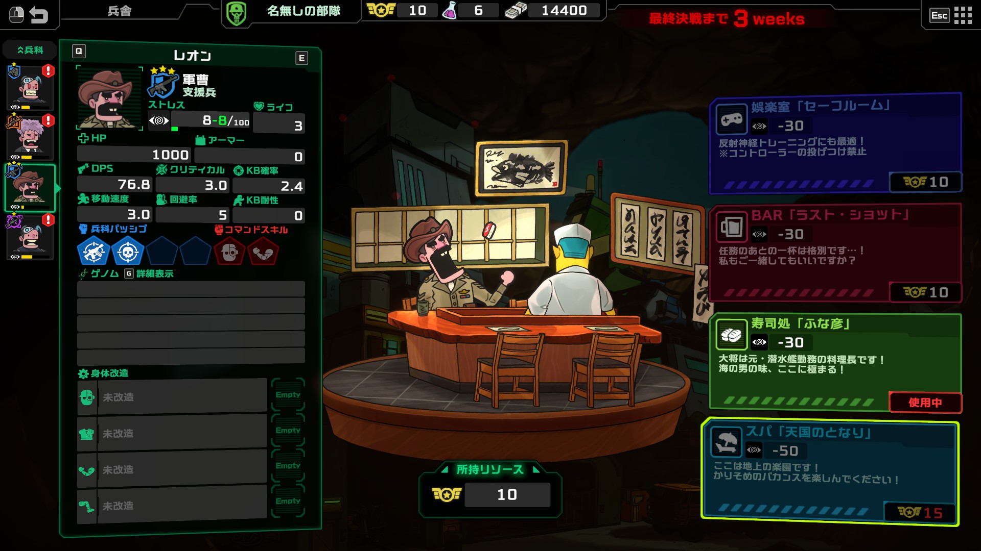そのほか、兵士の「退役」「解剖」「葬式」といった独自システムも備えており、これらの判断が部隊運用に深みを与えます。