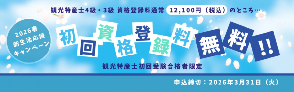 観光特産士(R)資格は登録制となっており、資格登録には申請書の提出と資格登録料25,300円(税込)(初回資格登録料12,100円、年間登録料13,200円)を支払うことで、観光特産士(R)資格認定証(カード)が発行されます。今回のキャンペーンは観光特産士(R)4級と3級合格者を対象として、資格登録料のうち初回資格登録料の12,100円を免除するものです。キャンペーンの申込締切は2026年3月31日(火)です。