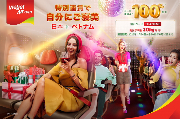 新たな節目と年末の旅行シーズンを記念して、ベトジェットは2025年11月24日から30日まで(*)の期間、日本 - ベトナム路線のエコチケットを対象に、「祝祭フライトで自分へのご褒美!」プロモーションを開催します。