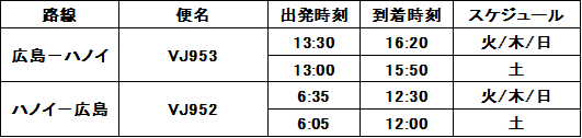 広島 - ハノイ線の運航スケジュール(いずれも現地時刻)