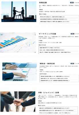 財務支援、マーケティング支援、補助金・融資支援、共創支援の4つのサービスを、カード形式で整理。それぞれの支援内容が一目で理解できる構成にしました。