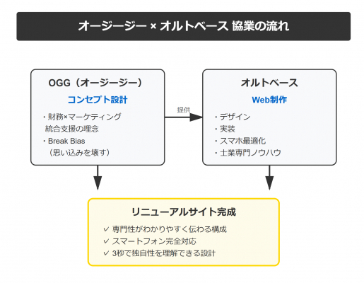 今回のリニューアルは、OGGの「戦略財務」という高度な専門性を、経営者が3秒で理解し、意思決定を加速させるという目標に対し、オルトベースが士業専門サイト制作で培った「信頼性と明快さを両立させる構造設計」という独自の強みが不可欠であると判断した、戦略的な協業です。