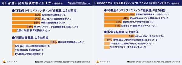 株式会社ベルテックス(所在地︓東京都新宿区、代表取締役︓梶尾 祐司)は、2025年10月、全国の20~60代の男女400名を対象に【不動産クラウドファンディングに関する意識調査】を実施しました。
