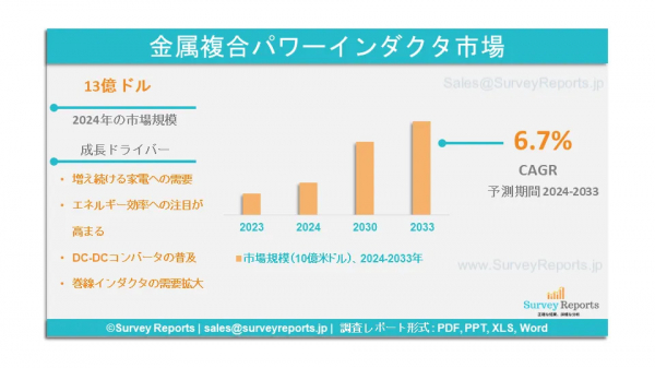 Survey Reports LLCは、2025年11月に調査レポートを発行したと発表した。金属複合パワーインダクタ市場は、タイプ別(薄膜タイプ、多層、巻線)に分類され、実装タイプ別(表面実装、スルーホール)に分類され、用途別(チューニング回路、DC-DCコンバータ 、フィルター、その他)、エンドユース産業別(自動車および輸送、産業、航空宇宙および防衛、家電、ITおよび通信、ヘルスケア、その他) - 2024年から2033年までの世界市場分析、動向、機会、予測を提供する。これは、金属複合パワーインダクタ市場の予測評価を提供する。金属複合パワーインダクタ市場の成長促進要因、市場機会、課題、脅威など、いくつかの重要な市場力学に焦点を当てている。