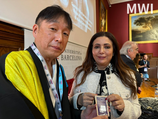 写真 ノーベル平和賞受賞者 Ouided Bouchamaouiさんに樽谷大助よりサダコの折り鶴のレプリカを贈呈