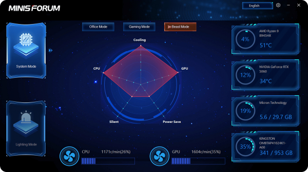 DP/HDMIポートを組み合わせた最大4画面出力に対応します。専用コントロールセンターにより、パフォーマンスモード(オフィス/ゲーム等)やRGBライトを自由にカスタマイズ可能です。