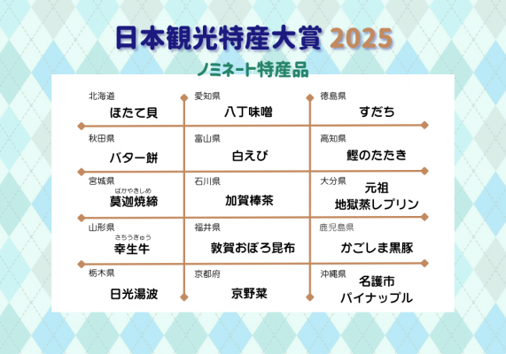 一般社団法人日本観光文化協会(東京都北区赤羽西1-22-15:会長 小塩稲之)は、今年で7回目になる、全国の観光特産品の知名度・ブランド力向上を目的とした観光特産品の表彰制度「日本観光特産大賞」のノミネート15品を発表します。
