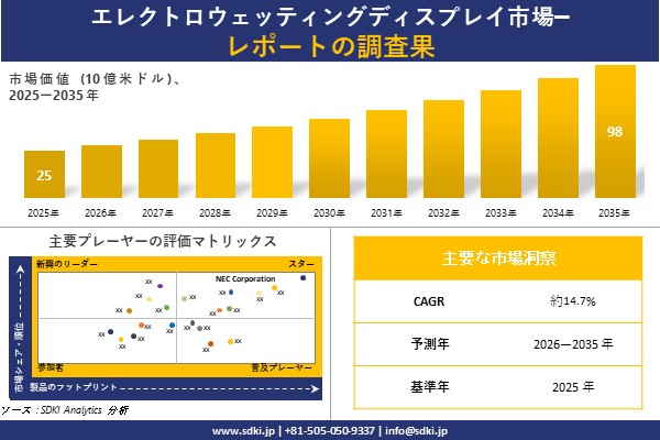 SDKI Analytics(本社:東京都渋谷区)は、このたび、2025年11月18に「エレクトロウェッティングディスプレイ市場調査レポート:2026-2035年の市場規模、シェア、傾向の予測」を発表しました。エレクトロウェッティングディスプレイに関する市場調査レポートには、統計的及び分析的アプローチを使用した予測評価が含まれています。この調査レポートでは、一次及び二次調査方法を使用して分析された主要な業界洞察を通じて将来の傾向を理解できるようにすることで、主要な市場動向を読者に説明しています。