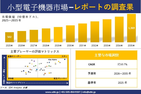 SDKI Analytics(本社:東京都渋谷区)は、このたび、2025年11月18に「小型電子機器市場調査レポート:2026-2035年の市場規模、シェア、傾向の予測」を発表しました。小型電子機器に関する市場調査レポートには、統計的及び分析的アプローチを使用した予測評価が含まれています。この調査レポートでは、一次及び二次調査方法を使用して分析された主要な業界洞察を通じて将来の傾向を理解できるようにすることで、主要な市場傾向を読者に説明しています。