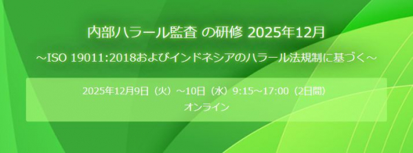 株式会社矢野経済研究所(本社:東京都中野区、代表取締役社長:水越 孝)とインドネシア政府公認の研修機関であるIHATECは、12月9日~10日の2日間、「内部ハラール監査の研修~ISO 19011:2018およびインドネシアのハラール法規制に基づく~」をオンラインで開催いたします。