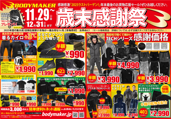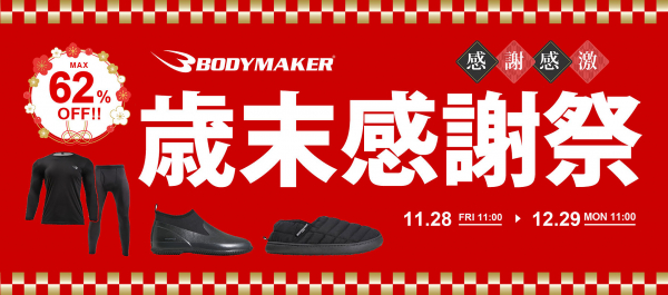 BODYMAKER(ボディメーカー)は、2025年ラストを飾る「歳末感謝祭」セールを11月28日(金)より12月29日(月)まで公式直営サイト及び直営店舗(11月29日(土)より)で開催します。新作・旧作アイテム大放出する冬のお買物応援セール!同時に同タイトルの店舗チラシを配布。新作ウエア、シューズ、サンダルなど中心に、トレーニングや格闘アイテムなどお買得アイテムを多数掲載。目玉アイテムを一部紹介すると、冬に活躍あったかウォームシューズ EG・ウォームシューズ¥1,990→¥990の半額、bmtwGYMウェアトレーニングロングパンツ1・2¥11,000→¥4,990の半額、スウェット裏起毛パーカー各種¥4,990→¥1,990の60%OFFなど、うれしい価格が多数登場。BODYMAKER(ボディメーカー)は、お客様がお得な買い物ができるように応援し続けます。ぜひ、一度ご覧ください。