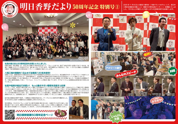 特別号その2では、2025年11月8日に大阪府の「八尾グランドホテル」にて開催した「明日香野創業50周年記念パーティー」の様子をお届けしています。西日本工場の120名を超える従業員とともに50周年を祝い、これからも「もっと働きやすい職場」を目指すと宣言されたパーティーの様子をぜひご一読ください。