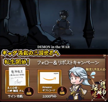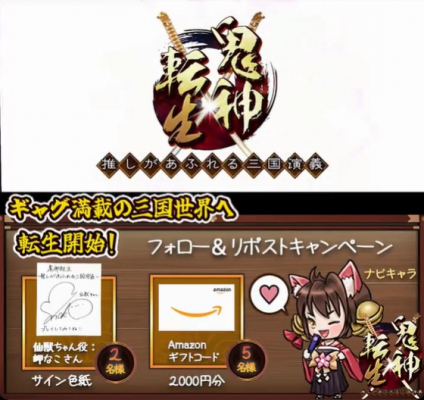 CenturyUU株式会社(本社:東京都千代田区)は、「Mobage」「Yahoo! Mobage」「ゲソてんbyGMO」「ヤマダゲーム」の4つのブラウザゲームプラットフォームに、ギャグ満載の三国志放置RPG『鬼神転生(きじんてんせい)~推しがあふれる三国演義~』の大型バージョンアップを記念して、プレゼントキャンペーンを開始したことを発表いたします。