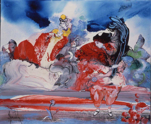 氏が訪日し、神社を訪れた際に神道や日本の神話について話を聞いたことが、創作活動の大きな転機となりました。氏はその時、「神話は自然と深い繋がりがある」と感じ、1990年より日本の古典『古事記』を読み解き始めます。豊かな色彩を用いて、神話から着想を得た風景を浮かび上がらせ、神々の世界をキャンバスに表現しました。