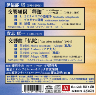 スリーシェルズは、藤岡幸夫指揮、東京シティ・フィルのCDとして「伊福部昭『釈迦』&貴志康一『仏陀』」を2025年12月14日に発売することを、11月28日に発表しました。