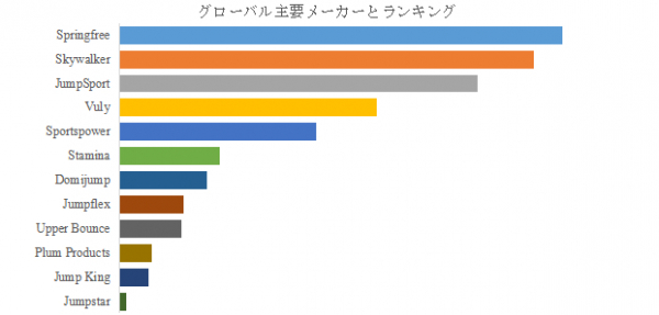 国内外の市場では、スポーツ用品メーカー、遊具メーカー、そしてフィットネス機器メーカーがそれぞれの得意分野を活かして競争を展開している。中国や台湾を拠点とする製造企業も多く、コスト競争力を持つ製品を提供している。主要企業は、独自のスプリングシステムやフレーム構造の開発による性能向上、利用者の体重や用途に応じた幅広い製品ラインナップの提供、そしてオンライン販売チャネルの強化を通じて差別化を図っている。また、スマートセンサーを搭載し、跳躍回数や消費カロリーを計測できるデジタル連携機能の導入も、新しい技術革新の方向性である。競合製品としては、ジョギング、ヨガ、各種フィットネス機器などが挙げられるが、トランポリン特有の「楽しさ」と「全身運動効果」は、独自の優位性を保っている。特に、日本の狭い住宅事情に対応した省スペース型や、静音設計の製品開発も重要な差別化要因となる。