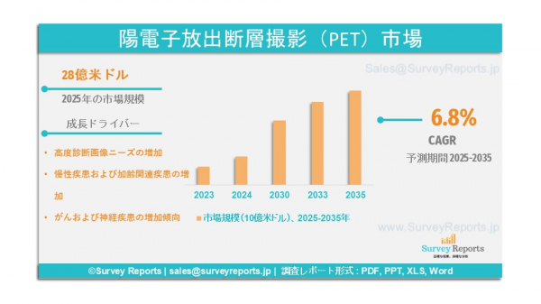 サーベイ・リポート社は、2025年11月付で「陽電子放出断層撮影(PET)市場」に関する調査報告書を発表いたしました。本報告書は、以下の区分に基づき分析を行っております:製品別セグメンテーション(スタンドアロンPETシステム、PET/CTシステム、PET/MRIシステム) 本レポートは、陽電子放出断層撮影(PET)市場の予測評価を提供しております。本レポートでは、陽電子放出断層撮影(PET)市場における成長要因、市場機会、課題、脅威など、いくつかの主要な市場動向を強調しております。
