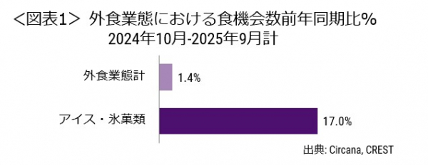 2024年10月-2025年9月計の外食業態計における食機会数の前年同期比は1.4%増加しましたが、そのうち、アイス・氷菓類の食機会数は、同17.0%増と大きく増加しました。