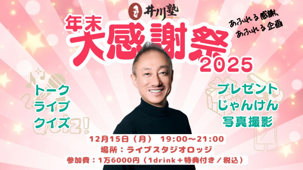 このたび、12月15日(月)、東京・代々木の「LIVE STUDIO LODGE」にて、年に一度のスペシャルイベント「井川塾 年末大感謝祭」を開催いたします。おかげさまで2025年の月例「井川塾」はすべて完売。1年の感謝を込めた、究極の“締めくくり”に相応しいプログラムをご用意しました。