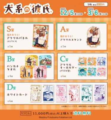 S賞は、犬飼くんと堅太郎さんの新規描き下ろしイラストを使用したアクリルパネル!A5サイズでイラストをお楽しみいただけます。 A賞は手軽に持ち運びが可能なアクリルスタンド!その他の賞も、カラーイラストやコミックスから厳選されたイラストをデザインした、どれが当たっても嬉しい豪華ラインナップです。