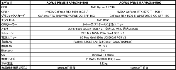 上位モデル「AORUS PRIME 5 AP5A7N8-5101」は、CPUにAMD Ryzen 7 9700X(8コア/16スレッド、3.8GHz/最大ブーストクロック5.5GHz)、GPUにNVIDIA GeForce RTX 5080 16GBを採用しています。下位モデル「AORUS PRIME 5 AP5A7N7T-5100」は、CPUに同じくAMD Ryzen 7 9700X、GPUにNVIDIA GeForce RTX 5070 Ti 16GBを採用。市場想定価格(税込)は、AORUS PRIME 5 AP5A7N8-5101が550,000円前後、AORUS PRIME 5 AP5A7N7T-5100が470,000円前後です。