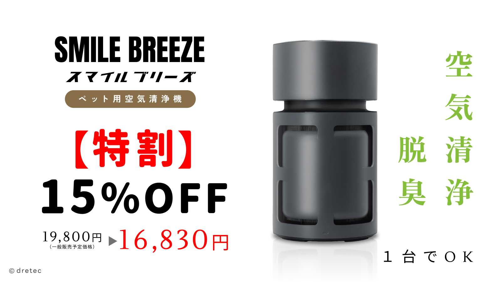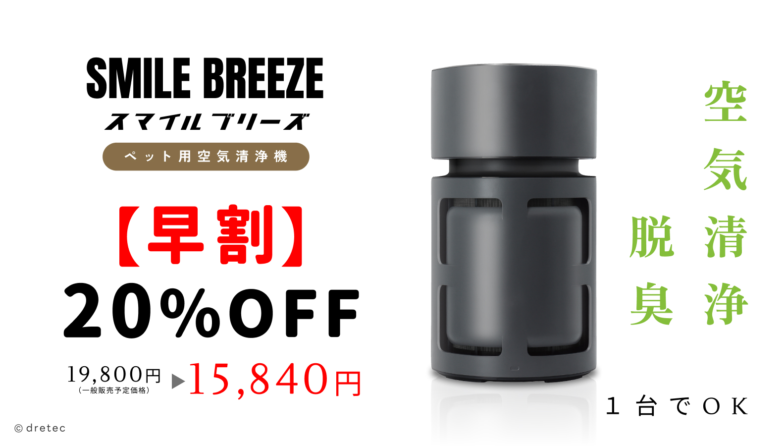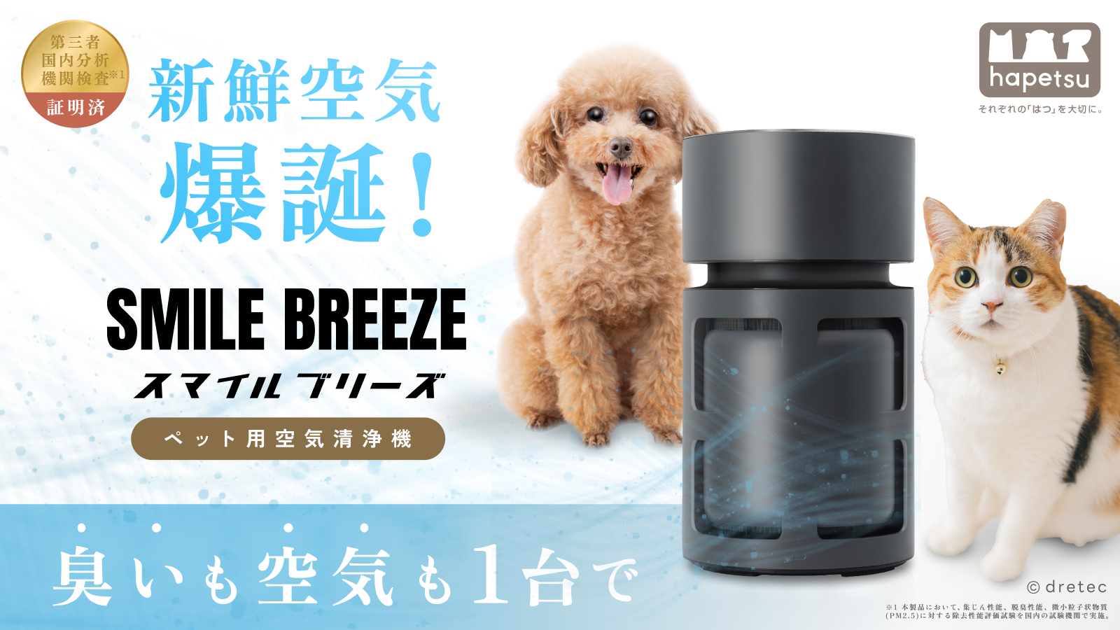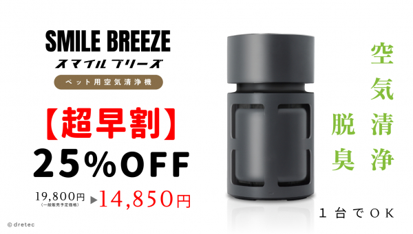 計量機器・家電・医療機器の企画販売等を行う株式会社ドリテック(本社:埼玉県川口市、代表取締役社長:千倉悟朗、以下「ドリテック」)は、ペットと暮らすご家庭向けに開発した小型空気清浄機「SMILE BREEZE(スマイルブリーズ) AC-100」を「Makuake(マクアケ)」にて販売開始いたします。
