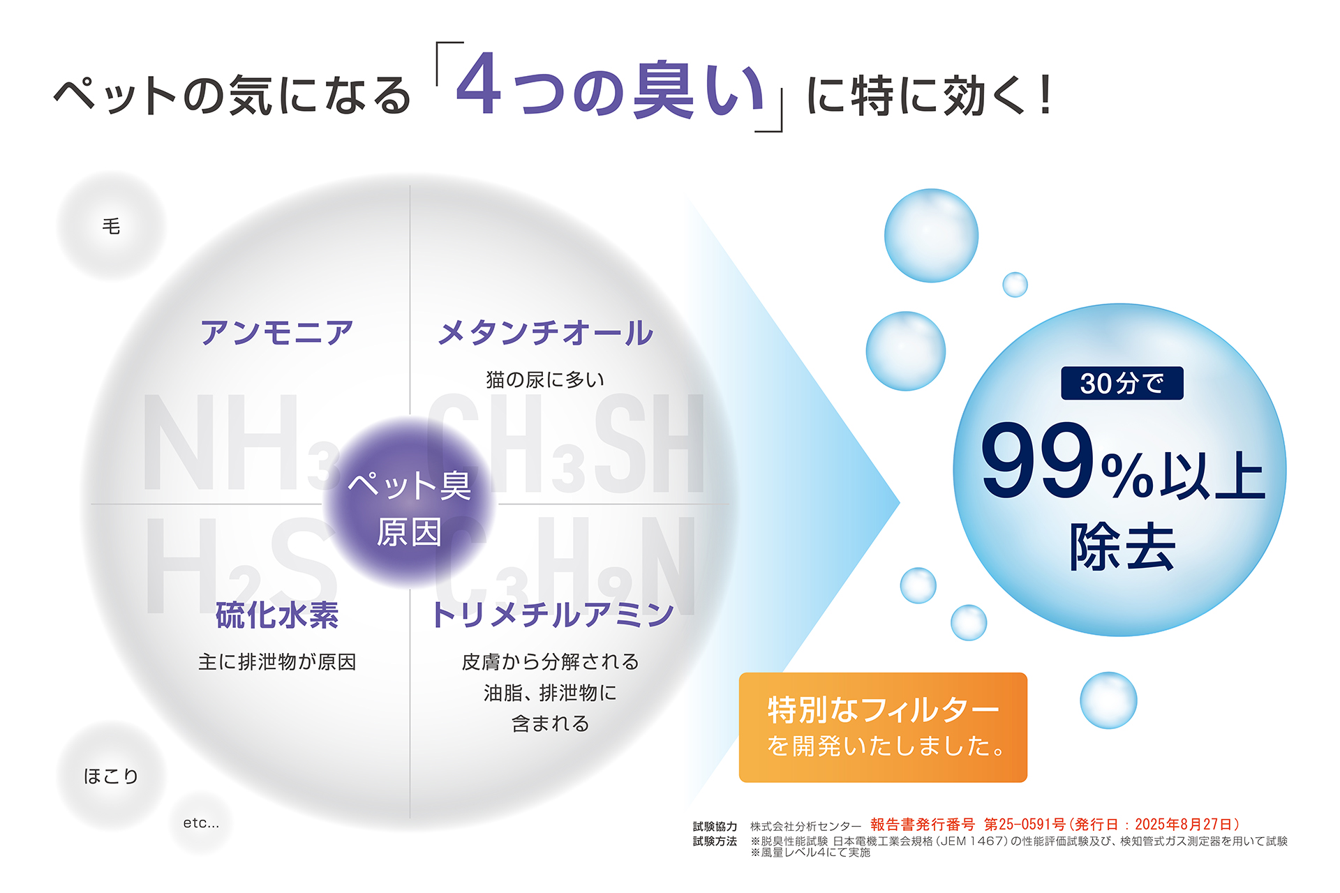 特にペット臭の中の 4物質(アンモニア・メタンチオール・硫化水素・トリメチルアミン)について、わずか30分で99%以上除去という高い脱臭性能※を実現しました。