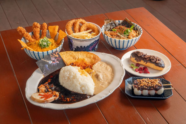 生まれ変わったコラボメニューのコンセプトは「大迫力」。映画『ゴジラVSモスラ』をイメージし、2体の怪獣を黒と白のカレーで表現した、2~3人前の超ボリューム「ゴジラVSモスラ W怪獣カレー」や、ゴジラ最大のライバルであるキングギドラを、黄金に輝く親子丼に3本のチキンカツとトルティーヤで表現し、見た目も胃袋にも大迫力の「胃袋破壊!キングギドラ丼」、ゴジラの禍々しい黒をイカ墨で表現し、唐揚げトッピングでゴツゴツ感とボリュームを増加させた「ゴジラ和風ブラックうどん」など、怪獣たちをさまざまな食材や料理で表現した、迫力満点のメニューが登場します。さらに、テイクアウトメニューも充実。「ゴジラ迎撃作戦」の巨大ゴジラがデザインされたオリジナルバケツに、オニオンフライとフライドポテトを満杯にして提供する「ゴジラバケツ」は家族みんなで楽しめるおススメテイクアウトメニュー!その他、片手で食べられるゴジラスイーツや新デザインのドリンクボトルも販売いたします。