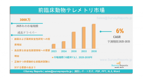 サーベイ・リポーツ株式会社は、2025年12月付で研究報告書を発表いたしました。本報告書は、前臨床動物テレメトリー市場を以下の区分で分析しております:・タイプ別(小型動物テレメトリーおよび大型動物テレメトリー)・エンドユーザー別(産業研究所・CRO、学術政府機関、その他研究機関) - グローバル市場分析、動向、機会、および予測(2025-2035年)本レポートは、前臨床動物テレメトリー市場に関する予測評価を提供しております。成長要因、市場機会、課題、脅威など、前臨床動物テレメトリー市場における主要な市場動向をいくつか強調しております。