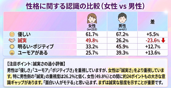男女の意識を比較すると、興味深い「すれ違い」が発見されました。男性は女性が思う以上に「顔立ち」を重要視(+17.8pt)している反面、女性が求める「誠実さ」については約24ポイントも低く見積もっていました。