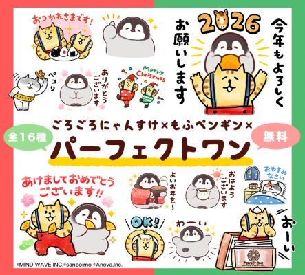 エイノバ株式会社(本社:東京都千代田区、代表取締役社長:安倍義人)のマネジメントするクリエイター さんぽいもが描く人気キャラクター「もふペンギン」と、「ごろごろにゃんすけ」(株式会社 マインドウェイブ)のコラボLINEスタンプが新日本製薬株式会社『パーフェクトワン』のLINE公式アカウントより、2025年12月9日(火)に無料配信されました。