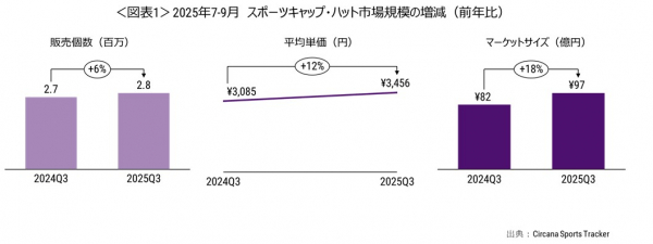 日本の2025年第3四半期(7-9月)のスポーツキャップ・ハットの市場規模は97億円で、前年比18%増でした。平均単価が同12%増と大きく増加しただけでなく、販売個数も同6%増、約10万個増加したことが、市場規模拡大に寄与しました。