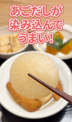 おでんの命である出汁は、地元醤油メーカーに、あご(トビウオ)出汁を加えたオリジナルの出汁を使用。あっさりとした中にコクのある旨味を再現しています。