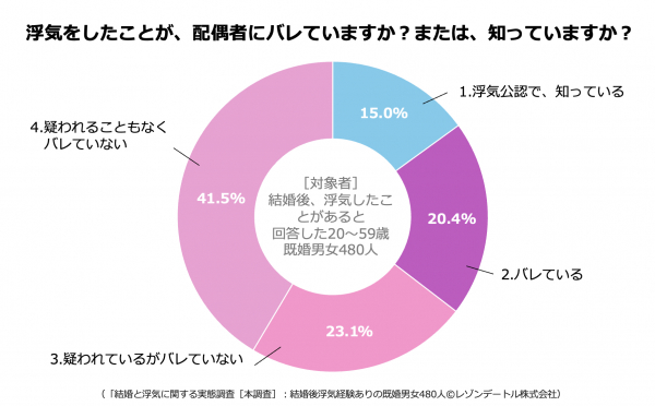 → 「疑われることもなくバレていない」と回答した人は約42%、「疑われてるがバレていない」と回答した人が約23%だったことから「配偶者にバレていない人」は約65%
